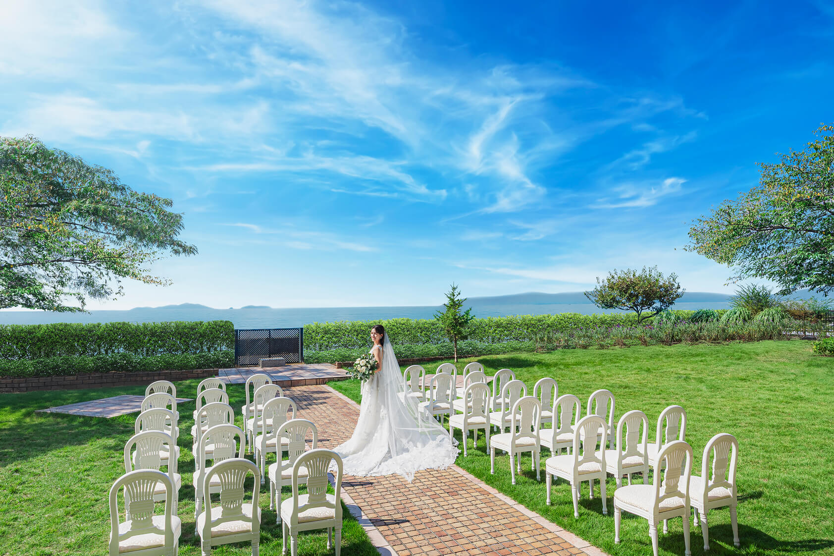 びわ湖まで数歩の「ガーデンチャペル」は、青空の下で誓いを交わす開放的なステージ。