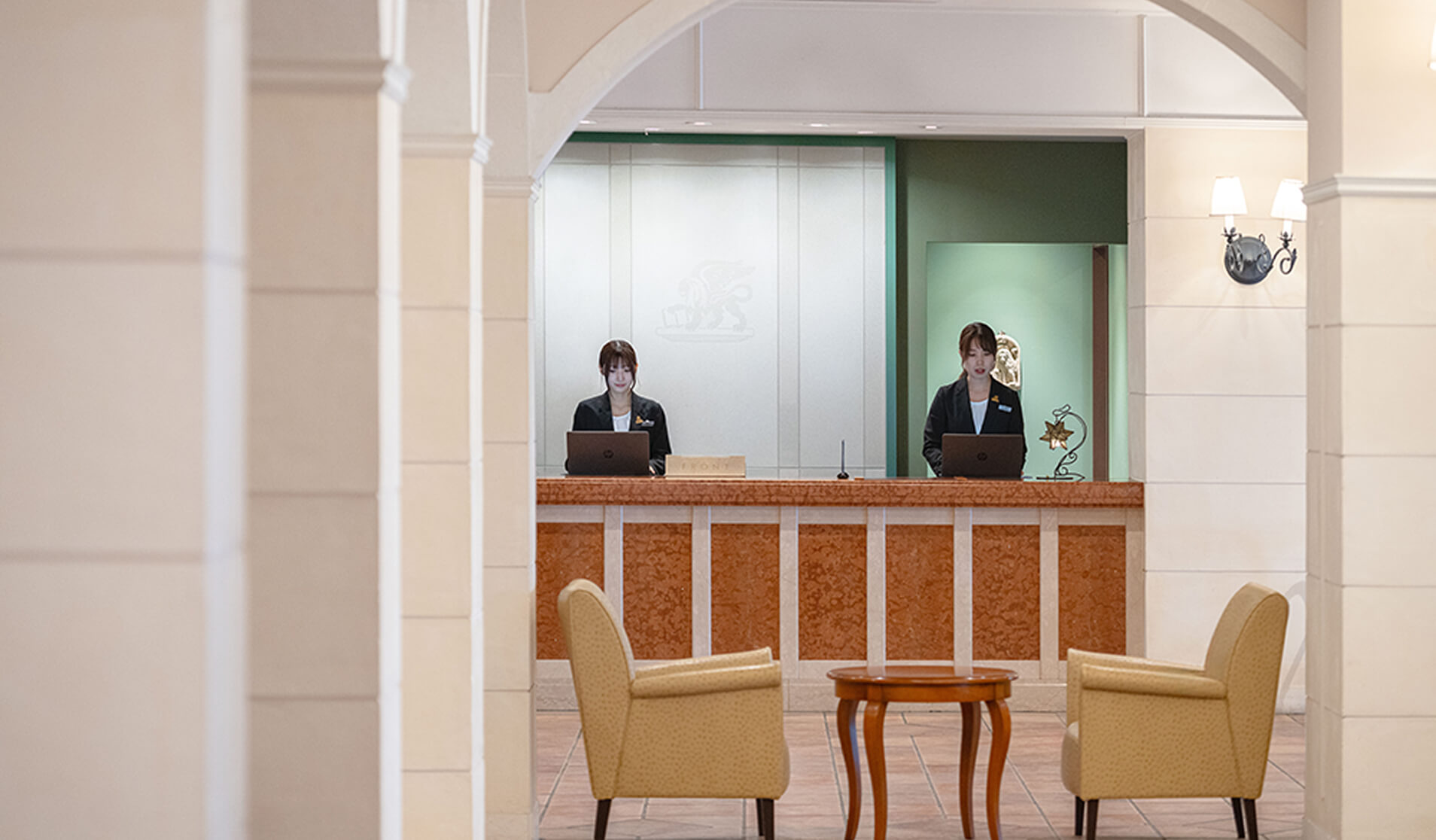 北びわ湖の景観に調和する、クラシックかつ温かみのある外観。アーチを描くデザインや石材の質感、ゆとりあるロビー空間など、異国情緒とリゾートの解放感がほどよく溶け合う独自の建築スタイルが魅力です。